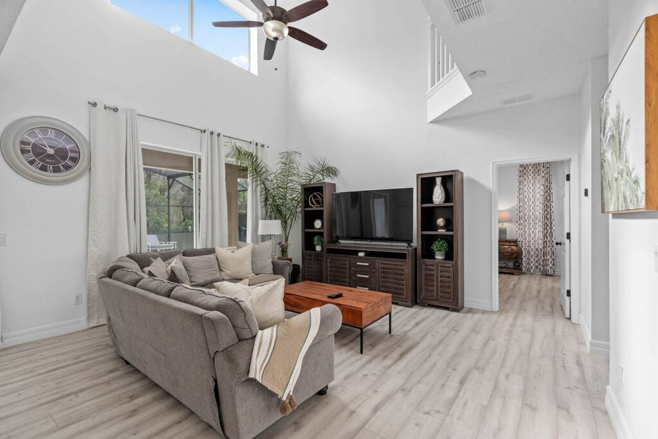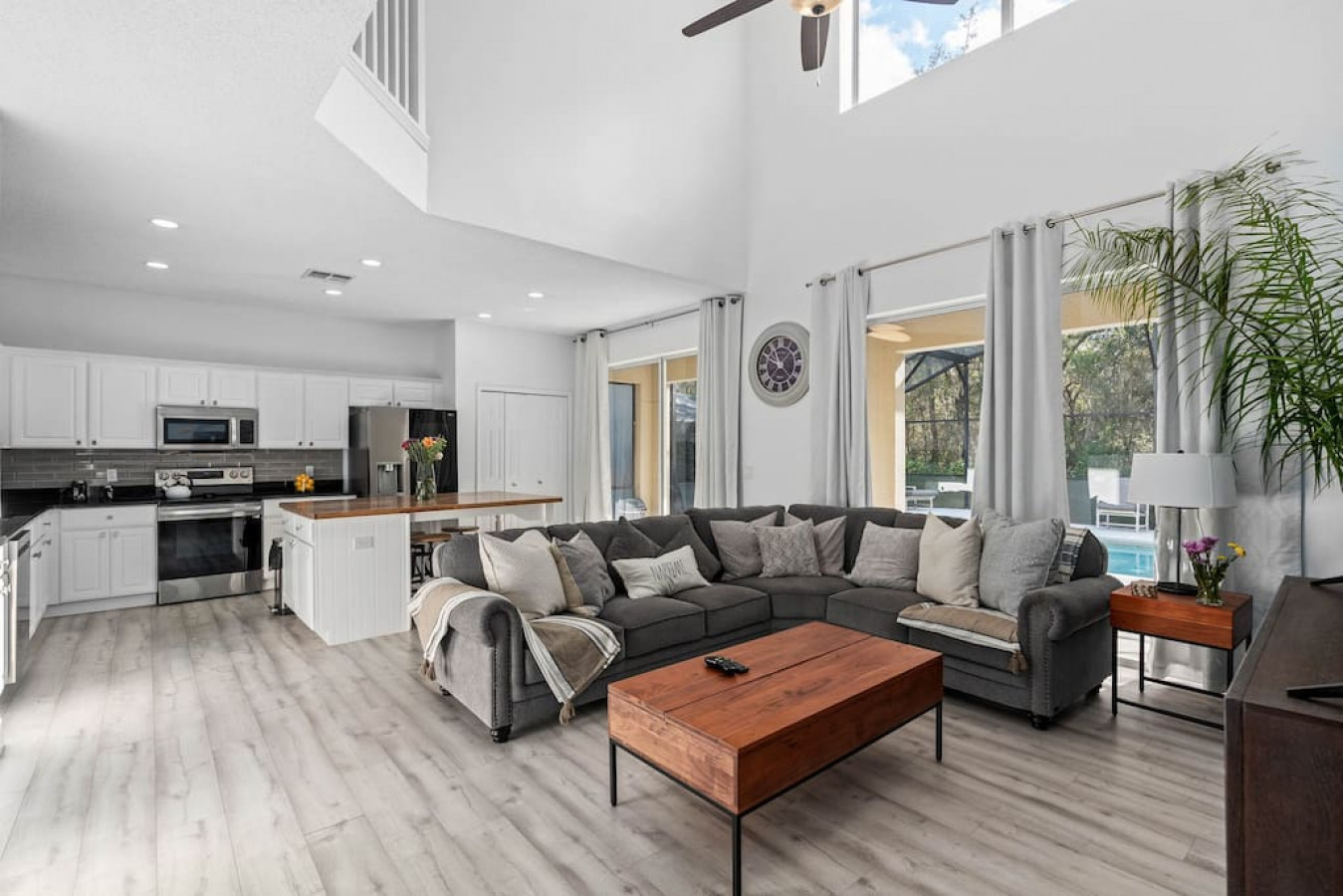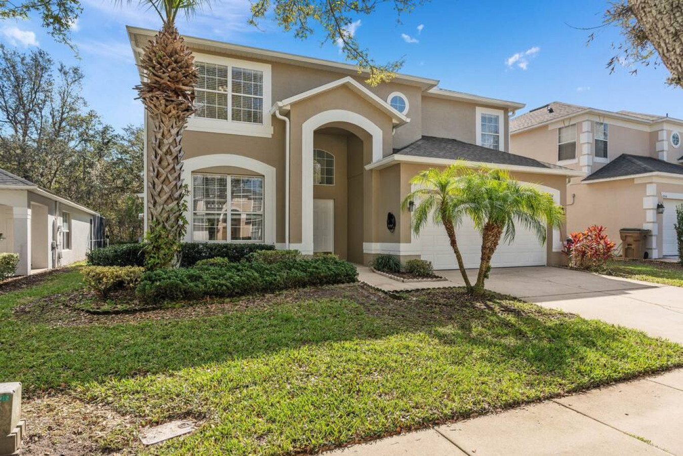 A tropical oasis in Central Florida. Come experience all the details this home away from home has to offer, with the added benefit of being centrally-located to the best attractions in Orlando. Discover magic and family fun at this elegant Emerald Island Resort escape. Perfect for a group getaway, this inviting seven-bedroom home comes fully furnished for modern comfort and carefree vacation living. Close to great golf, Disney parks, and Orlando attractions this two-story retreat comes packed with endless opportunities for entertainment, with private features including a sparkling pool, spa, and game room. On-site perks include a pool area complete with a tropical bar, plus mini golf, sports courts, and a gym. Spend days at your own private pool complete with a spa, and soak-up the good times around the fully screened lanai. When you're hungry, fire up the gas grill for a poolside barbecue. Challenge guests to some friendly competition ini the game room with a few rounds of pool and Ping-Pong. The gorgeous full kitchen showcases sparkling counters and a suite of stainless steel appliances, including an eat-in kitchen for four. A pass-through window connects the dining area, with table seating 8. Spread across two floors, the bedrooms offer private comfort for everyone, including three, kid's bedrooms. A primary suite on each floor includes private en suite bathroom access. Home essentials include central air-conditioning, free WiFi, and a private washer/dryer. EMERALD ISLAND AMENITIES - Outdoor pool & spa (heated, up to 5’-deep) - Poolside tropical bar - Fitness center -Mini golf at resort - Sauna - Lighted tennis courts - Basketball court - Sand volleyball court - Nature trails - Playgrounds - Clubhouse with business center THINGS TO KNOW Media Streaming: Services and apps are available on each Smart TV and guests can use their own account. Pets: The pet fee is $75 for the entire stay (this is for additional cleaning). A maximum of 2 dogs allowed. Please pick up any dog waste. Parking notes: There is free parking for 2 vehicles. A Tesla Electric Vehicle Charger with a universal J1772 plug is available and free of cost. Pool Heat Fee: 1 day notification is required in order to heat the pool. A fee of $35 per day must be paid prior to check-in. Please reach out to me after booking to purchase pool heat for your stay.